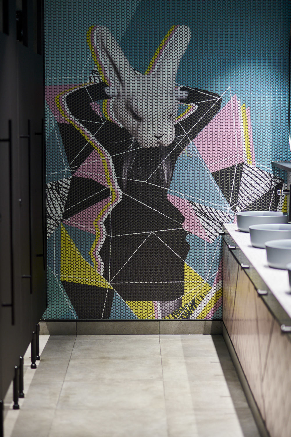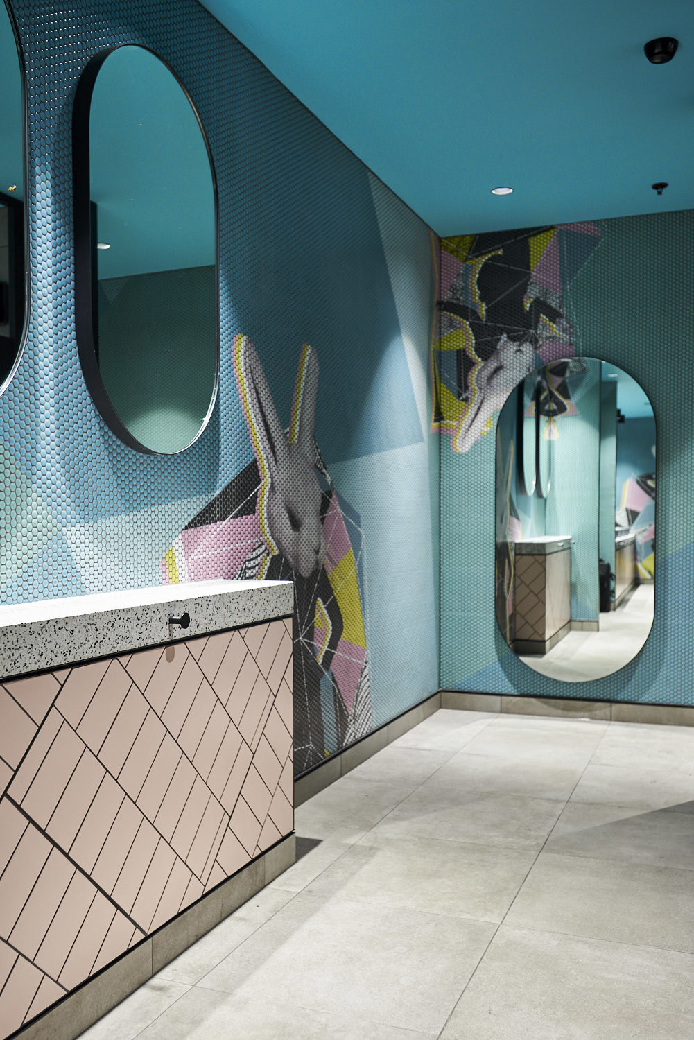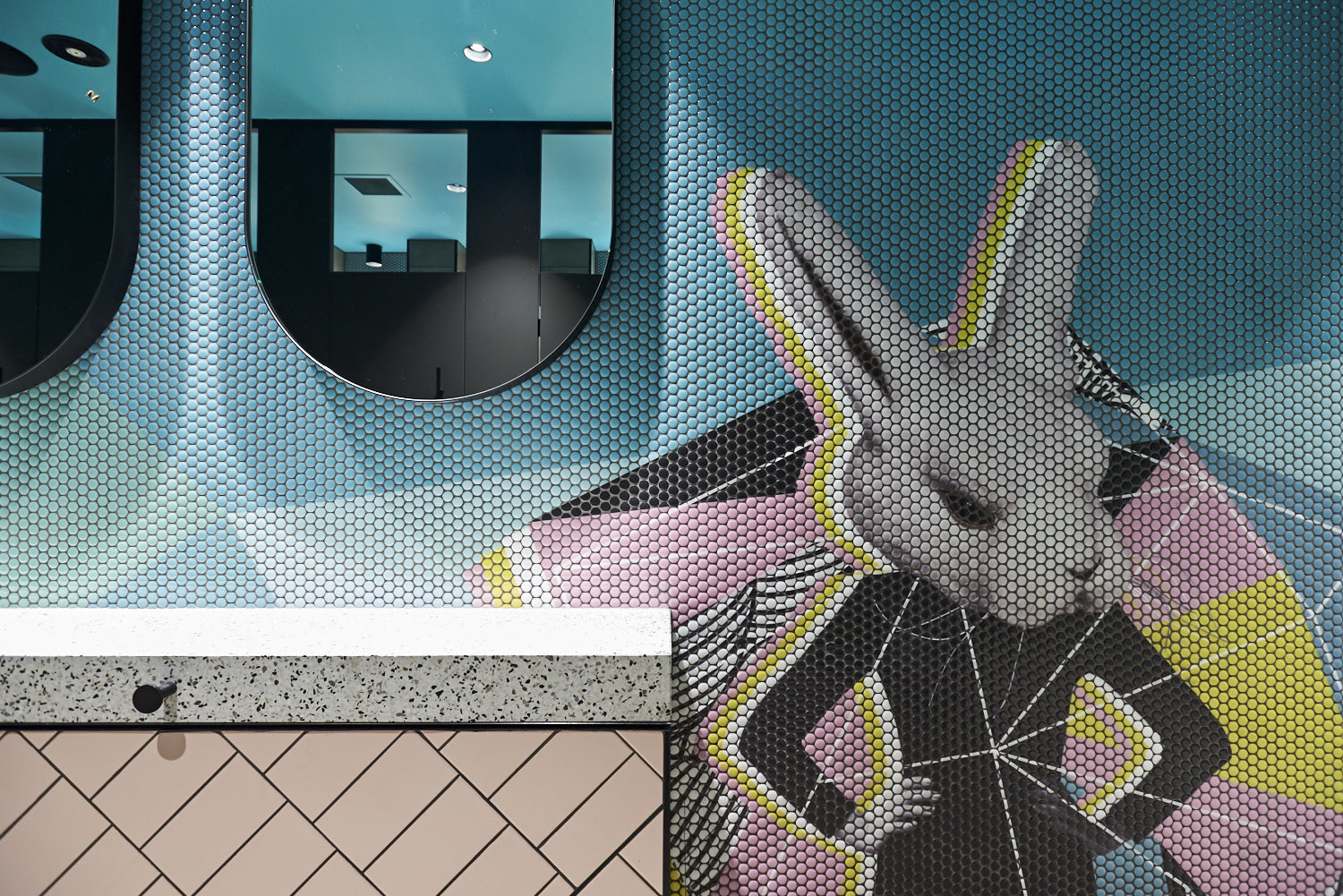 Using “Mosaico Digitale” – the i2C design team designed a beautiful pop art style design of rabbits with with big pops of vibrant aqua greens, blush pinks and yellows to create one of the most fun and out there bathrooms we’ve ever seen!